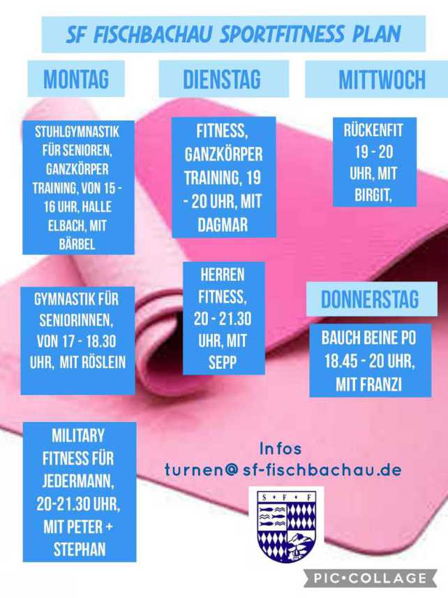 Info: Übungsleiterin Birgit Puschner (birgitpuschner@gmail.com; oder WhatsApp unter 015752685968) oder turnen@sf-fischbachau.de